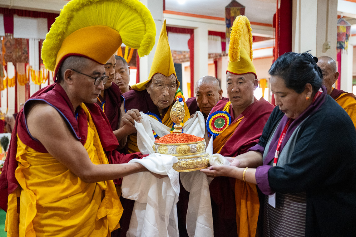 ཆོ་ག་བཟླས་པའི་བར་གསུངས་རྗེས་ཚོགས་འཁོར་འདེགས་འབུལ་དང་། གསོལ་འདེབས་མཎྜལ་སྐབས་དགའ་ལྡན་ཁྲི་རིན་པོ་ཆེ་མཆོག་ནས་ཚོམ་བུ་འདེགས་འབུལ་དང་ཤར་བྱང་གི་གྲྭ་ཚང་གཉིས་ཀྱི་མཁན་རིན་པོ་ཆེ་རྣམ་པ་གཉིས། ས་གནས་གཞིས་འགོ་བཅས་ནས་འདེབས་འབུལ་རམ་འདེགས་དང་། ཆོ་གའི་ཚིག་རིས་དང་བསྟུན་ནས་སྐུ་རྟེན། གསུང་རྟེན། ཐུགས་རྟེན། ཚེ་བུམ། ཚེ་ཆང་། ཚེ་རིལ། བླ་གོས། སྣམ་སྦྱར། ཐང་གོས། གདིང་བ། ལྷུང་བཟེད། མཁར་གསིལ། རིགས་ལྔའི་མཚན་མ། རྒྱལ་སྲིད་སྣ་བདུན། རྟགས་བརྒྱད། རྫས་བརྒྱད་རྣམས་རིམ་པར་འདེགས་འབུལ་རྗེས་དབུ་བཞུགས་རྡོ་རྗེ་སློབ་དཔོན་དགའ་ལྡན་ཁྲི་རིན་པོ་ཆེ་༸རྗེ་བཙུན་བློ་བཟང་རྡོ་རྗེ་དཔལ་བཟང་པོ་མཆོག་དང་། ཤར་པ་ཆོས་རྗེ་ངག་དབང་འབྱོར་ལྡན་རིན་པོ་ཆེ། ཤར་བྱང་གྲྭ་ཚང་གཉིས་ཀྱི་མཁན་རིན་པོ་ཆེ་རྣམ་གཉིས། མཁར་ཟུར་རྣམ་པ། རྙིང་མ་མཁན་རིན་པོ་ཆེ། ཞལ་ངོ་རྣམ་གཉིས། ཕྱག་མཛོད་ཁག སྦྱིན་བདག་བཅས་ནས་མཇལ་ཁ་དང་། ༸རྒྱལ་བའི་ཞབས་བརྟན་གསུང་མུར་འབུལ་དངོས་བསྟར།