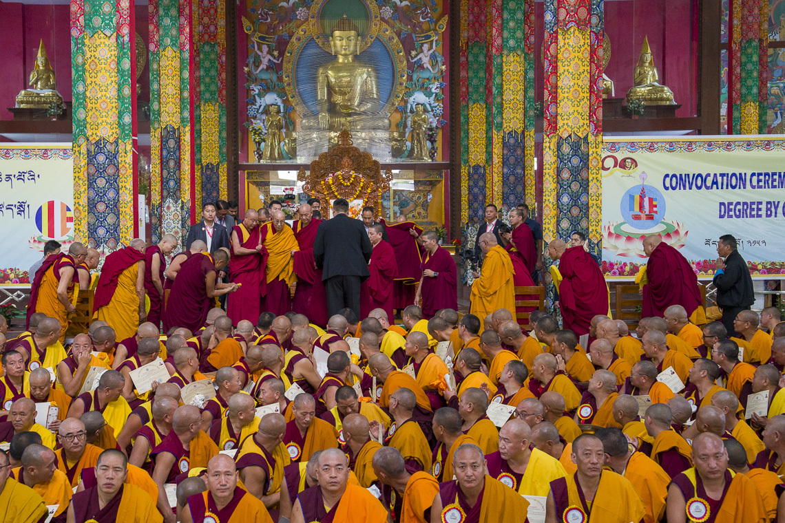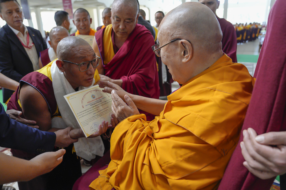 དེ་ཡང་སྔ་དྲོ་ཆུ་ཚོད་ ༧།༣༠ ཙམ་ལ་སྐབས་བཅུ་དྲུག་པའི་དགེ་ལྡན་ལུགས་བཟང་གཙུག་ལག་སློབ་གཉེར་ཁང་གི་དགེ་བཤེས་ལྷ་རམས་པའི་ཕྱག་འཁྱེར་གནང་བའི་མཛད་སྒོར་དགའ་ལྡན་ཁྲི་རིན་པོ་ཆེ་༸རྗེ་བཙུན་བློ་བཟང་རྡོ་རྗེ་དཔལ་བཟང་པོ་མཆོག་དབུ་བཞུགས་ཐོག་རྒྱུགས་སྤྲོད་དོ་དམ་པས་སློབ་གཉེར་ཁང་གི་བྱུང་རིམ་དང་ད་ལྟའི་གནས་སྟངས། ཕྱག་འཁྱེར་གྱི་གལ་གནད་སོགས་ངོ་སྤྲོད་སྙིང་བསྡུས་སྙན་སྒྲོན་ཞུས་མཚམས། དགའ་ལྡན་ཁྲི་རིན་པོ་ཆེ་མཆོག་གིས་ཕྱི་ལོ་ ༢༠༢༤ ལོར་དགེ་ལུགས་རྒྱུགས་སྤྲོད་ཆེན་མོའི་སློབ་གཉེར་མཐར་ཕྱིན་པའི་དགེ་འདུན་པ་ ༡༧༤ དང་། ཕྱི་ལོ་ ༢༠༢༥ ལོར་དགེ་ལུགས་རྒྱུགས་སྤྲོད་ཀྱི་སློབ་གཉེར་མཐར་ཕྱིན་པའི་དགེ་འདུན་པ་ ༡༨༠ ལ་དགེ་ལྡན་ལུགས་བཟང་གཙུག་ལག་སློབ་གཉེར་ཁང་གི་སྐབས་བཅུ་དྲུག་པའི་དགེ་བཤེས་ལྷ་རམས་པའི་བསླབ་པ་མཐར་སོན་པའི་ཕྱག་འཁྱེར་གནང་།