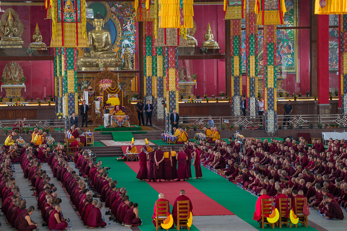 དེ་ཡང་ཕྱི་དྲོ་ཆུ་ཚོད་གཉིས་པ་ཡོལ་ཙམ་ལ་སྤྱི་ནོར་༸གོང་ས་༸སྐྱབས་མགོན་ཆེན་པོ་མཆོག་སྒོ་མང་ཆོས་གྲྭ་ཆེན་མོའི་ཡང་ཐོག་གི་གཟིམ་ཆུང་ནས་ཆོས་གྲྭར་ཆིབས་བསྒྱུར་སྐབས་དགའ་ལྡན་ཁྲི་རིན་པོ་ཆེ་རྗེ་བཙུན་བློ་བཟང་རྡོ་རྗེ་དཔལ་བཟང་པོ་མཆོག་དང་། འབྲས་སྤུངས་ཁྲི་ཟུར་དཀོན་མཆོག་པ་སངས་མཆོག ཁྲི་ཟུར་བློ་བཟང་བསྟན་པ་མཆོག སྒོ་མང་མཁན་རིན་པོ་ཆེ་འཇིགས་མེད་རྒྱ་མཚོ་མཆོག བློ་གླིང་མཁན་རིན་པོ་ཆེ་ཡེ་ཤེས་ལྷུན་གྲུབ་མཆོག་སོགས་དཔལ་ལྡན་འབྲས་སྤུངས་དགོན་པའི་མཁན་བླ་སྤྲུལ་སོགས་ཀྱིས་ཕེབས་བསུ་དང་འབྲེལ་བཞུགས་ཁྲིར་འཁོད་མཚམས་དགའ་ལྡན་ཁྲི་རིན་པོ་ཆེ་མཆོག་གིས་མཇལ་ཁ་ཞུས་པ་དང་། དེ་རྗེས་གདན་ས་ཆེན་མོ་སེ་འབྲས་དགའ་གསུམ་གྱི་གྲྭ་ཚང་དྲུག་དང་བཀྲ་ཤིས་ལྷུན་པོ། རྭ་སྟོད་གྲྭ་ཚང་བཅས་ཀྱི་དགེ་ལུགས་རྒྱུགས་སྤྲོད་ཆེན་མོར་འགྲིམས་བཞིན་པའི་བཀའ་རམས་དང་སློབ་དཔོན་གྱི་སློབ་གཉེར་བ་རྣམས་ཀྱི་བྱམས་ཆོས་དམ་བཅའ་ཆེན་མོ་དབུ་འཛུགས་ཀྱིས་ཆུ་ཚོད་གཉིས་མ་ཟིན་ཙམ་གྱི་རིང་དབུ་བཞུགས་ཀྱིས་དགྱེས་གཟིགས་མཛད་ཡོད།