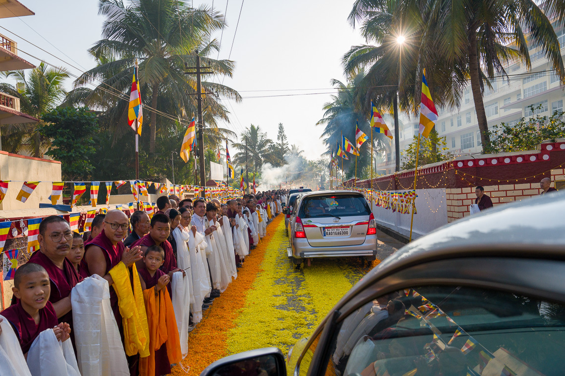 དེ་ཡང་ཞོགས་པ་ནས་སློབ་གཉེར་ཁང་གི་མདུན་ཐང་དུ་དགེ་འདུན་འདུས་མང་ནས་རྗེ་ཙོང་ཁ་པ་ཆེན་པོས་མཛད་པའི་དྲང་ངེས་ལེགས་བཤད་སྙིང་པོ་གསུང་འདོན་གྱིས་ཕེབས་སྒུག་ཞུས་ཤིང་། ཆུ་ཚོད་ ༨།༣༠ ཙམ་ལ་སྤྱི་ནོར་༸གོང་ས་༸སྐྱབས་མགོན་ཆེན་པོ་མཆོག་དཔལ་ལྡན་འབྲས་སྤུངས་ནས་དགའ་ལྡན་བྱང་རྩེ་གྲྭ་ཚང་གི་སློབ་གཉེར་ཁང་སྐལ་བཟང་དགའ་ཚལ་དུ་ཆིབས་བསྒྱུར་སྐབས། དགའ་ལྡན་བྱང་རྩེ་གྲྭ་ཚང་གི་མཁན་རིན་པོ་ཆེ་མཆོག་དང་བླ་མ་ལས་སྣེ། སློབ་གཉེར་ཁང་འདིའི་སྦྱིན་བདག་དགའ་བྱང་ཀླུ་འབུམ་མཚན་སྒྲོགས་རིན་པོ་ཆེ་བསྟན་འཛིན་ཆོས་ཀྱི་རྒྱལ་མཚན་མཆོག་དང་མཛད་སྒོར་ཕེབས་པའི་ཁོང་གི་སློབ་མ་རྣམས་ནས་ཕེབས་བསུ་དང་། དགའ་ལྡན་ཁྲི་རིན་པོ་ཆེ་མཆོག་དང་ཤར་རྩེ་ཆོས་རྗེས་ཕེབས་བསུའི་མཇལ་ཁ་ཞུས་ཡོད།