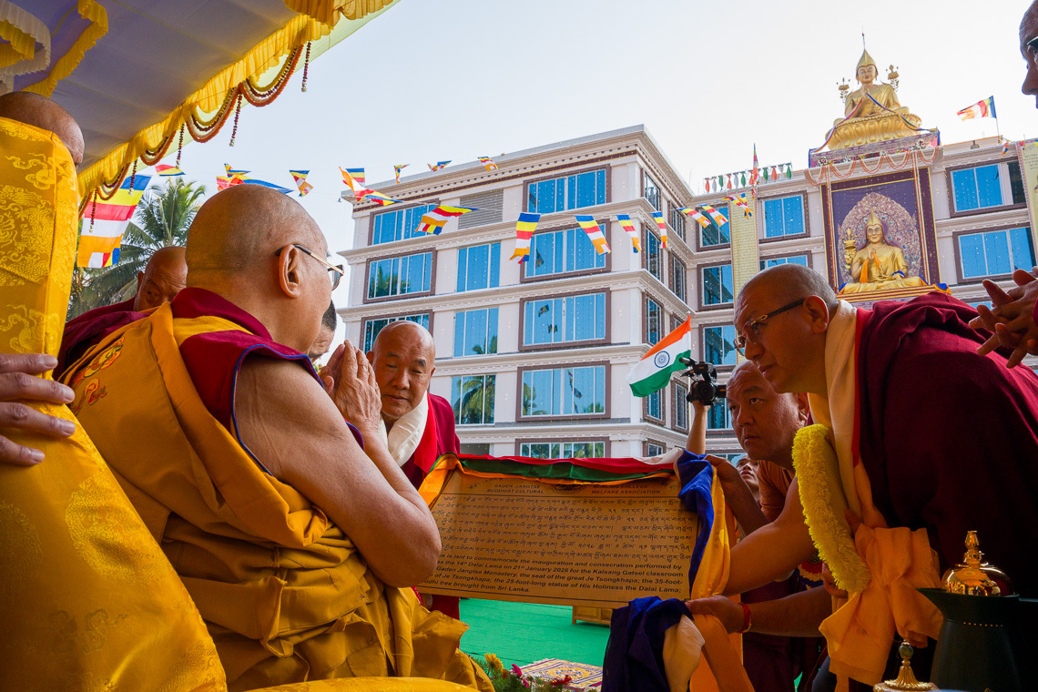 ༄༅། །ཕྱི་ལོ་ ༢༠༢༦ ཟླ་ ༡ ཚེས་ ༢༡ ཉིན་སྤྱི་ནོར་༸གོང་ས་༸སྐྱབས་མགོན་ཆེན་པོ་མཆོག་གིས་རྗེ་བླ་མ་ཙོང་ཁ་པའི་གདན་ས་དགའ་ལྡན་བྱང་རྩེ་ཐོས་བསམ་ནོར་གླིང་གཙུག་ལག་སློབ་གཉེར་ཁང་ཆེན་མོ་སྐལ་བཟང་དགའ་ཚལ་དང་། ༸རྗེ་ཚེ་འཛིན་མའི་སྐུ་བརྙན་ཕི་ཌི་ ༣༥ ཅན་དང་། ༧གོང་ས་༧སྐྱབས་མགོན་རྒྱལ་དབང་བཅུ་བཞི་བ་མཆོག་གི་སྐུ་བརྙན་མཐོང་གྲོལ་རིན་པོ་ཆེ་ཕི་ཌི་ ༢༥ ཅན་གསར་བཞེངས་ཀྱིས་སློབ་གཉེར་ཁང་རྟེན་དང་བརྟེན་པ་ལེགས་པར་གྲུབ་པ་དབུ་འབྱེད་དང་རབ་གནས་ཀྱི་བྱིན་རླབས་མཛད་ཡོད་པ་རེད།