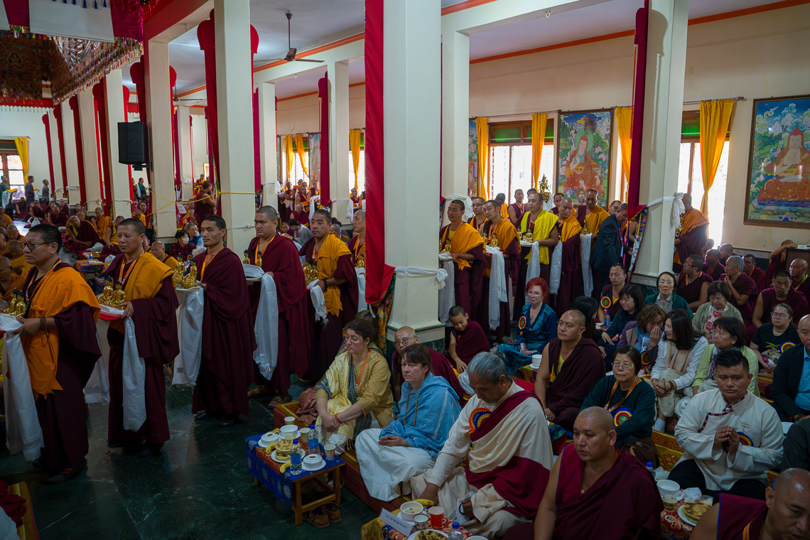 ཆོ་ག་བཟླས་པའི་བར་གསུངས་རྗེས་ཚོགས་འཁོར་འདེགས་འབུལ་དང་། གསོལ་འདེབས་མཎྜལ་སྐབས་དགའ་ལྡན་ཁྲི་རིན་པོ་ཆེ་མཆོག་ནས་ཚོམ་བུ་འདེགས་འབུལ་དང་ཤར་བྱང་གི་གྲྭ་ཚང་གཉིས་ཀྱི་མཁན་རིན་པོ་ཆེ་རྣམ་པ་གཉིས། ས་གནས་གཞིས་འགོ་བཅས་ནས་འདེབས་འབུལ་རམ་འདེགས་དང་། ཆོ་གའི་ཚིག་རིས་དང་བསྟུན་ནས་སྐུ་རྟེན། གསུང་རྟེན། ཐུགས་རྟེན། ཚེ་བུམ། ཚེ་ཆང་། ཚེ་རིལ། བླ་གོས། སྣམ་སྦྱར། ཐང་གོས། གདིང་བ། ལྷུང་བཟེད། མཁར་གསིལ། རིགས་ལྔའི་མཚན་མ། རྒྱལ་སྲིད་སྣ་བདུན། རྟགས་བརྒྱད། རྫས་བརྒྱད་རྣམས་རིམ་པར་འདེགས་འབུལ་རྗེས་དབུ་བཞུགས་རྡོ་རྗེ་སློབ་དཔོན་དགའ་ལྡན་ཁྲི་རིན་པོ་ཆེ་༸རྗེ་བཙུན་བློ་བཟང་རྡོ་རྗེ་དཔལ་བཟང་པོ་མཆོག་དང་། ཤར་པ་ཆོས་རྗེ་ངག་དབང་འབྱོར་ལྡན་རིན་པོ་ཆེ། ཤར་བྱང་གྲྭ་ཚང་གཉིས་ཀྱི་མཁན་རིན་པོ་ཆེ་རྣམ་གཉིས། མཁར་ཟུར་རྣམ་པ། རྙིང་མ་མཁན་རིན་པོ་ཆེ། ཞལ་ངོ་རྣམ་གཉིས། ཕྱག་མཛོད་ཁག སྦྱིན་བདག་བཅས་ནས་མཇལ་ཁ་དང་། ༸རྒྱལ་བའི་ཞབས་བརྟན་གསུང་མུར་འབུལ་དངོས་བསྟར།
